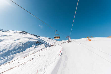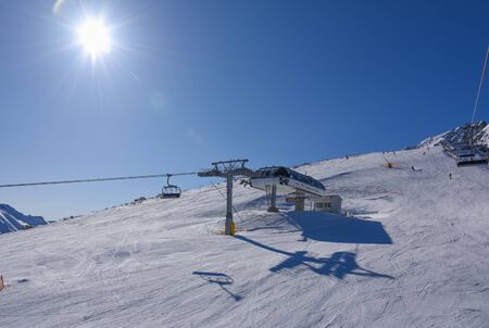 Ski lifts in the Alp mountains, Tirol, Austria. Bright blue sky and mountain covered with snow.
