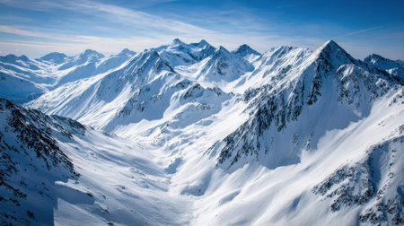 An awe-inspiring aerial view showcases snow-covered peaks against a brilliant blue sky, capturing the purity and serenity of a remote mountain landscape.