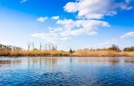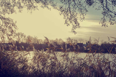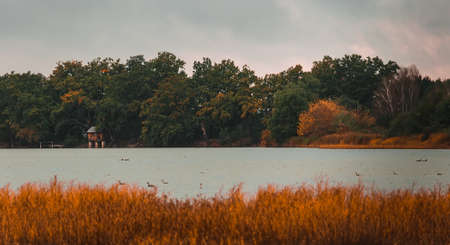 Swamped high grass on pond edge with trees and sky. Autumn colored Czech landscape