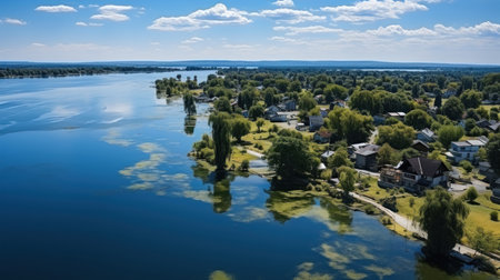 Aerial landscape view on Volga river with islands and green forest. Picturesque panoramic view from the height on the touristic part of the Volga river near Samara city at summer sunny day.