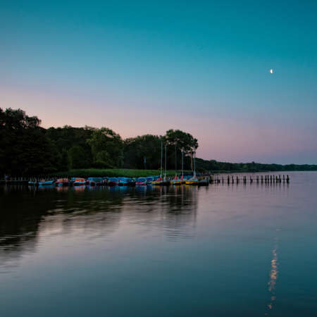 View on Ratzenburger See. Lake with boats, sailboats, blue sky. Schleswig Holstein, Ratzenburg, Germany