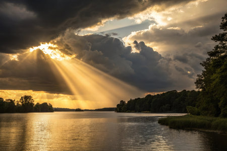 Sunrise over beautiful lake in Mazury lake district. Morning in Poland. Lake alndscape at sunrise