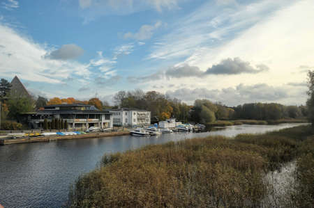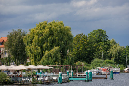 View to the peninsula of Hermannswerder, near the town of Potsdam, Brandenburg, Germany. Hermannswerder is situated between the River Havel and the the Lake Lake Templin. The navigable River Havel flows through the lake. So lakes are some neogothic buildi