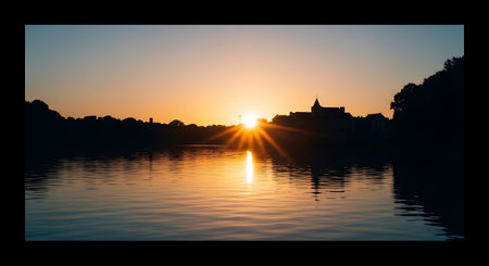 Magical sunset over the lake. Landscape panorama. View from above. Serene lake in the evening. Nature landscape
