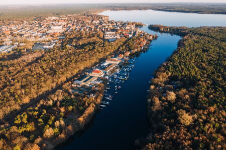 Photo taken from drone, panoramic view of Ilawa town in Poland and surrouding area, Jeziorak lake.
