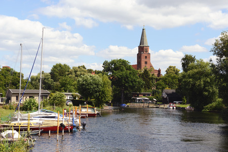 BRANDENBURG AN DER HAVEL, BRANDENBURG / GERMANY June 28 2015: Cathedral of Brandenburg with boat in a marina at Havel River. gardens all around.