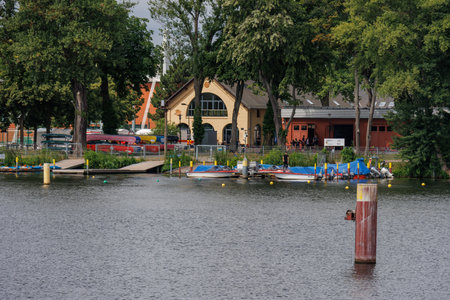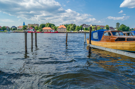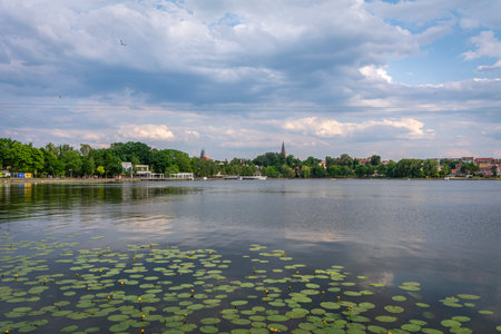 SCHWERIN, GERMANY - June 15, 2021 Ziegelsee with lakeside promenade
