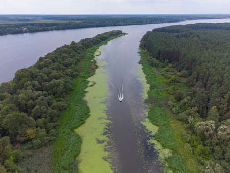 Beautiful landscape at cloudy day with small boat swimming on river and green trees and bushes on both sides of river