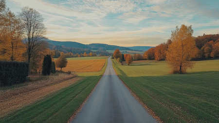 This stunning aerial photograph showcases an empty road winding through a vibrant autumn forest. Trees display bright colors, creating a serene and inviting landscape.