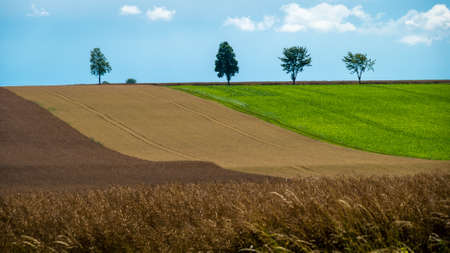 Beautiful meadow. Green agricultural fields of Moravia at daytime. Nice weather.