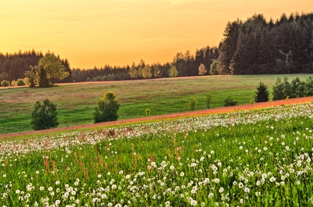 Field yellow flowers and sunset landscape