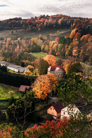 Zagorze Slaskie, Poland - October 27, 2021:Autumnal mountain landscape viewed from the Grodno Castle, Poland. Old residential houses, colourful foliage on the trees.