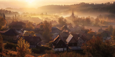 A scenic view of a quiet village nestled among fog-covered mountains and autumn foliage, showcasing charming houses and lush greenery.