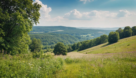 A serene and expansive landscape of lush green rolling hills and gentle valleys stretches towards the horizon under a clear, bright blue sky. The undulating terrain is covered in vibrant green grass, with scattered clusters of trees and distant forests adding depth to the scene. The sunlight casts a soft, even light across the undulating landscape, highlighting its natural beauty and creating a sense of peace and tranquility. This picturesque view evokes a feeling of vastness and the simple,...