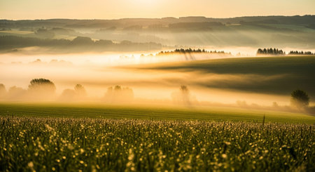 showing rolling green hills bathed in golden sunrise light with rays of sun piercing through morning mist....