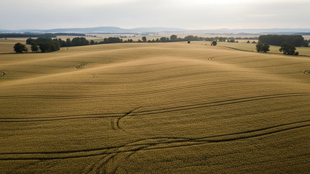 Casting showing expansive golden wheat fields with rolling hills and winding tire tracks illuminated by the warm glow of a setting sun casting long shadows across...