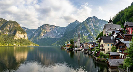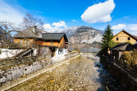 Beautiful Hallstatt Village with the mountain lake in sunny day. Hallstatt is a charming lakeside village in the Alps.