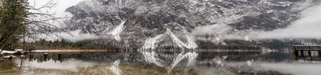 Panoramic image of beautiful lake Bohinj with decaying wooden piers and snowy mountains in background which are also reflecting in the water.