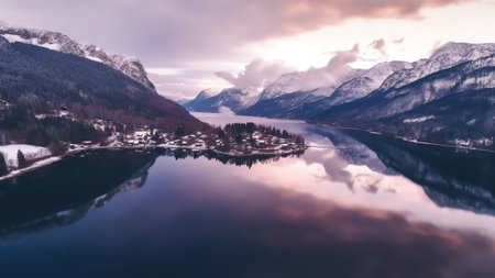 Aerial panoramic drone shot of Salzkammergut Mountains around Hallstatt lake in Austria in winter time during sunset