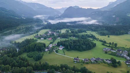 Aerial view of the morning foggy landscape in the alpine mountains