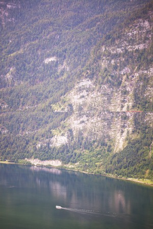 Aerial view of the beautiful lake in Austria on the lake in the mountains with boat