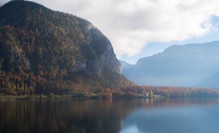 Idyllic morning colorful autumn alpine view. Peaceful mountain lake with clear transparent water and reflections. Hallstatter lake, Upper Austria.