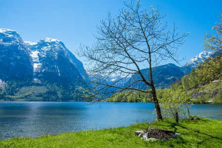 lakeside, tree on turf background mountain in clear blue sky on summer, Hallstatt, Austria