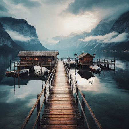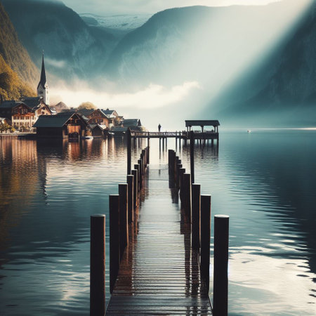 Hallstatt Austria. In the early morning the sun rises, fog over the lake. Peace and quiet.