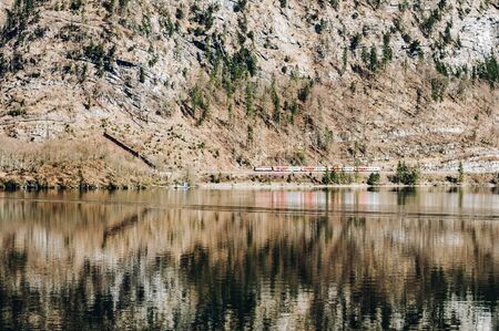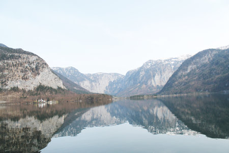 The reflection of snow mountain landscape in a lake at Hallstatt, Austria