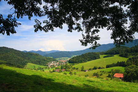 Scenic view of a picturesque mountain forest in summertime with house on a meadow, Black Forest, Germany