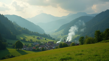 Tranquil village nestled in lush valley with smoke rising from chimneys