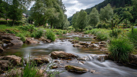 A tranquil scene showcasing a gentle stream flowing over moss-covered rocks, surrounded by lush greenery in a serene forest environment, inviting relaxation.