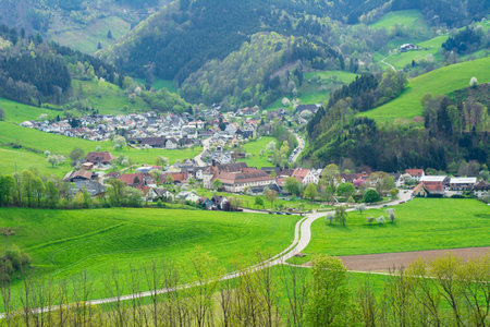 Panoramic view of a village in the Alps in Germany in spring with green meadows and forest. Ariel view of valley country houses with a lot of greenery