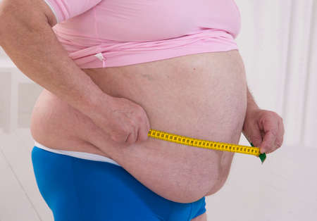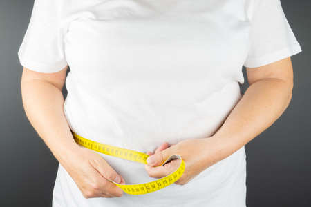 Fat mature woman measuring her belly with measurement tape