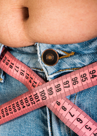 Woman showing fat belly. Pink tape measure