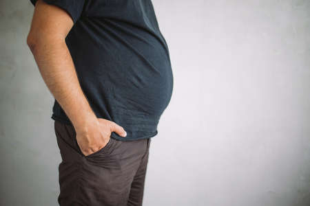 Overweight man with excess belly fat, copy space