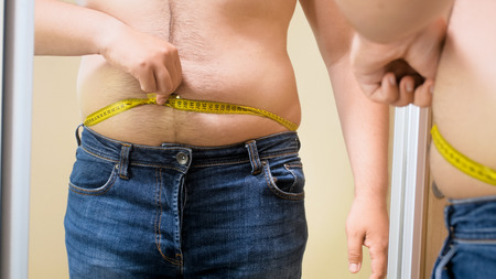 Man measuring his fat belly with measurement tape