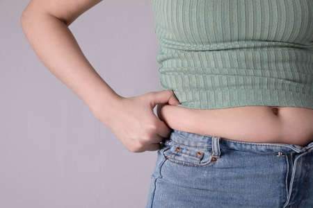 woman's hand holding excessive belly fat, overweight concept