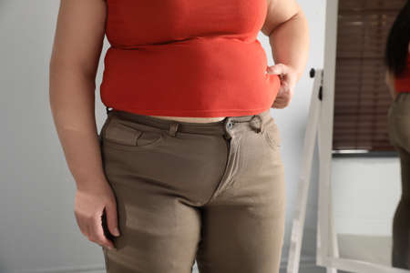 Overweight woman in tight shirt and trousers at home, closeup