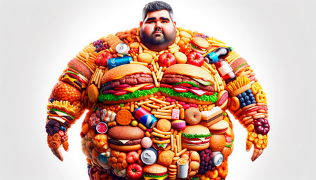The problem of obesity, the body of a fat person is crammed with burgers. Overweight, fast food, junk food. 3D illustration, 3D rendering