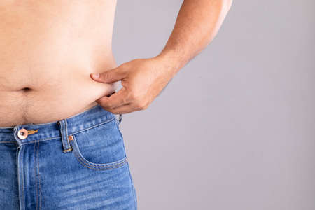 Close up fat man pinching his left tummy studio shot on grey background with copy space for text or design. Fat people and healthy concept