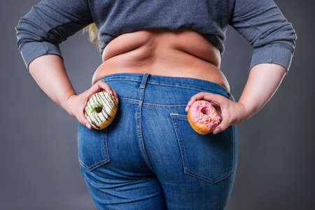 Fat woman posing with donuts on a gray background, fast food and unhealthy nutrition concept