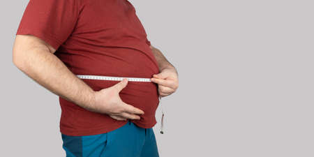 fat man measures the size of the abdomen with a centimeter measuring tape. people suffer from excess weight. banner, copy space