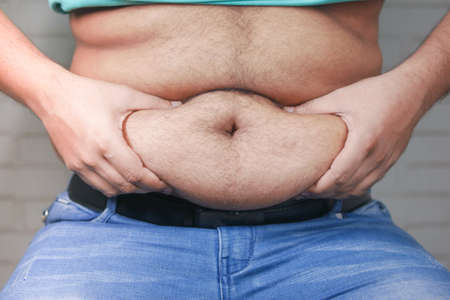 Close up of an obese mans overweight tummy. Unhealthy waistline