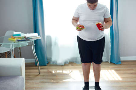 fat teen boy check his weight on scales, want to lose some kilo but at the same time he is eating unhealthy junk food. at home