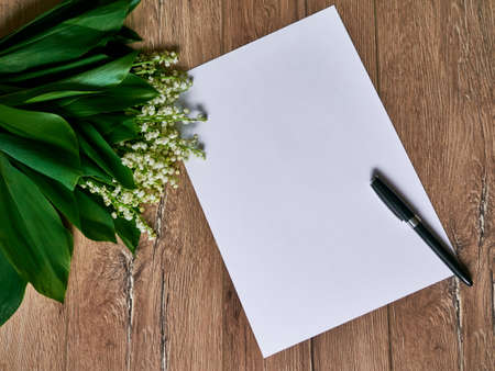 Bouquet of flowers lily of the valley and empty paper sheet on wooden rustic table from above, beautiful vintage card, top view, space for text, flat lay.