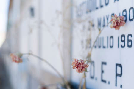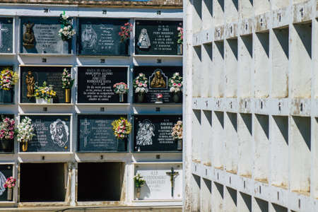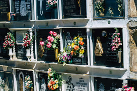 Seville Spain September 21, 2021 Typical graves in a Christian cemetery of the municipality of Carmona in Andalusia in southern Spain, the graves are made in the depth of a wall and richly decorated