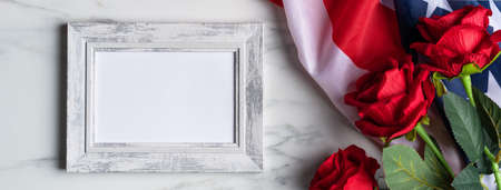 Concept of US Independence day or Memorial day. National flag and red rose over bright marble table background with picture frame.