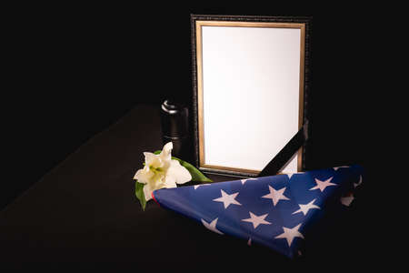 Funeral. Mockup of portrait of the deceased, of dead person. Frame with black ribbon near flowers, candles and cross on black background top view