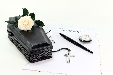 Book, carnation flowers, funeral ribbon and cross on black background with space for text